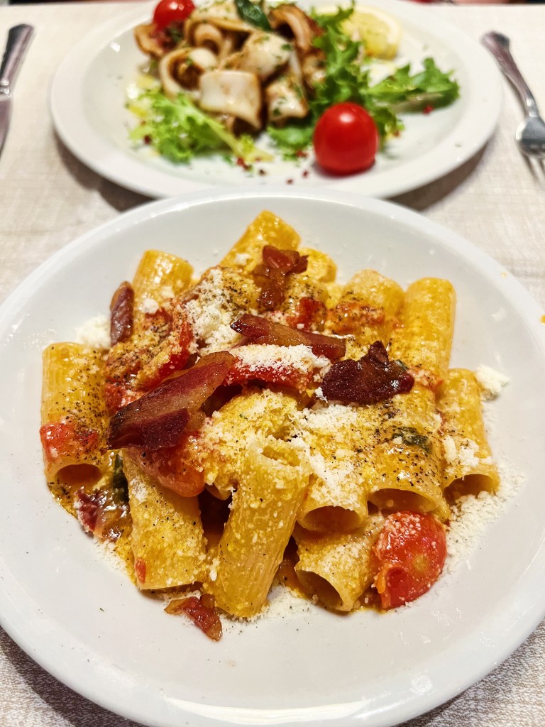 I was on a personal quest to try all four of the classic Roman pastas during our trip, so I had to order the Amatriciana. This iconic pasta is a beautiful combination of tomatoes, savory guanciale (cured pork cheek), and sharp pecorino romano cheese. Bulzoni serves their version with rigatoni, which is probably my favorite pasta shape because its ridges hold the rich sauce so perfectly. It was absolutely delicious. My husband opted for a lighter plate and ordered the grilled octopus. And let me just say, well done to Bulzoni! So often, octopus can be tough or chewy, but this was cooked to perfection. It was incredibly tender and served simply in a butter and lemon sauce that added a wonderful freshness and brightness to the dish.