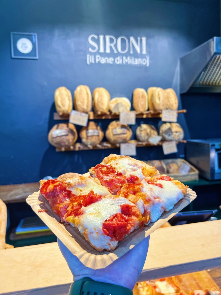 You’ll find delicious pizza by the slice, thick and crispy focaccia, croissants and other pastries, and beautiful loaves of bread. The smell walking by was too hard to ignore so we grabbed a slice of their focaccia pizza.